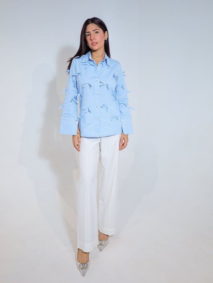 Description: Add a whimsical touch to your wardrobe with our Bow Charm Shirt — a fresh take on a classic button-down. Crafted in a soft powder blue hue, this shirt features playful bow details all over the front and sleeves, adding a hint of charm and femininity. The structured collar, full sleeves with cuff detailing, and a relaxed fit make it both stylish and comfortable. Perfect for brunches, day outings, or casual Fridays, this shirt blends minimalism with statement-making design effortlessly.