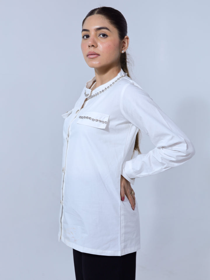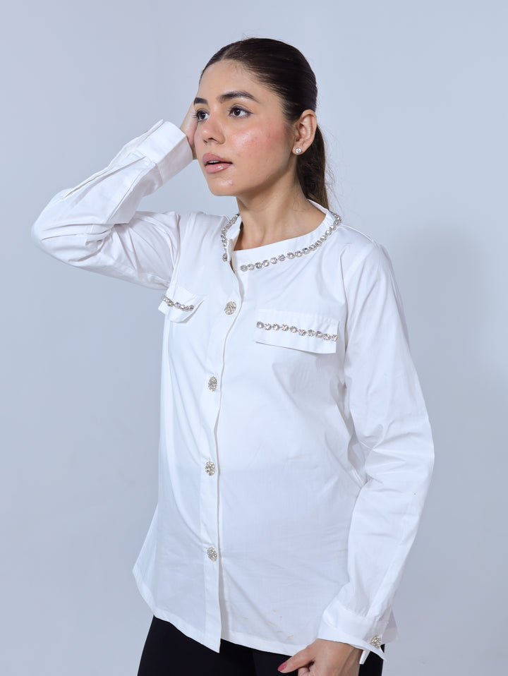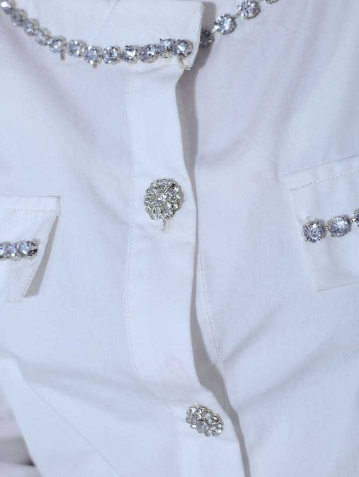 Description: This crisp white shirt features a flattering round neckline and is adorned with glistening crystal embellishments along the collar, front button placket, and dual chest pockets. The crystal-detailed buttons add a touch of glamour, while the soft cotton fabric ensures all-day comfort.