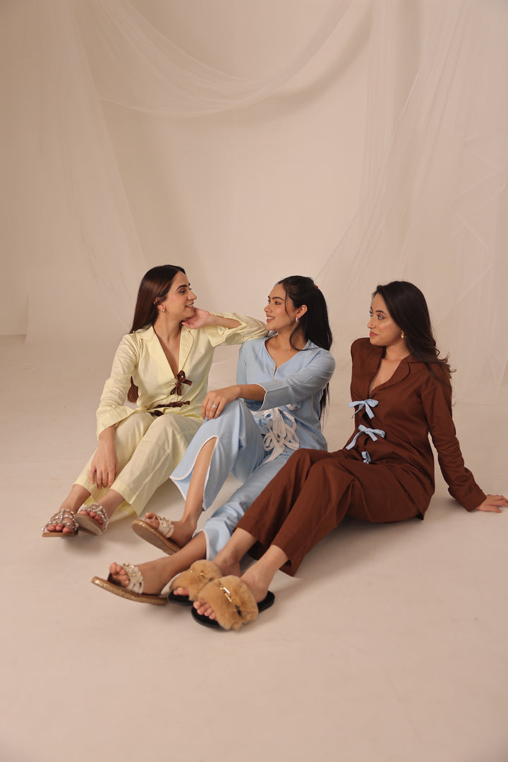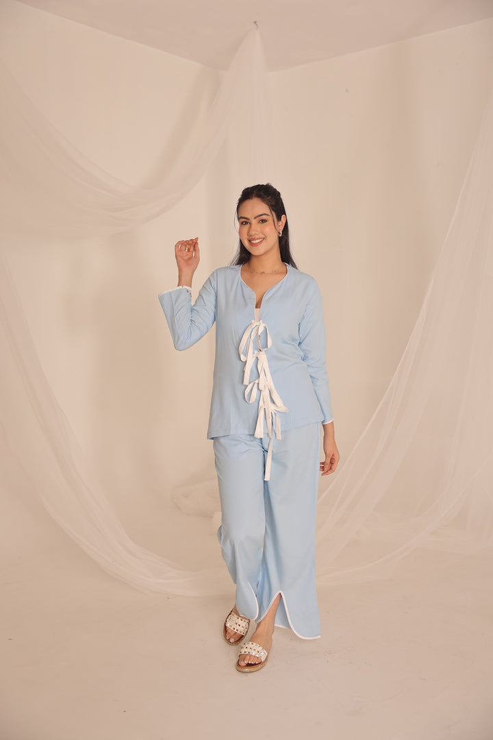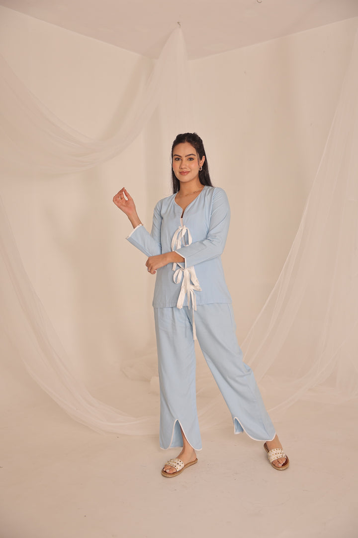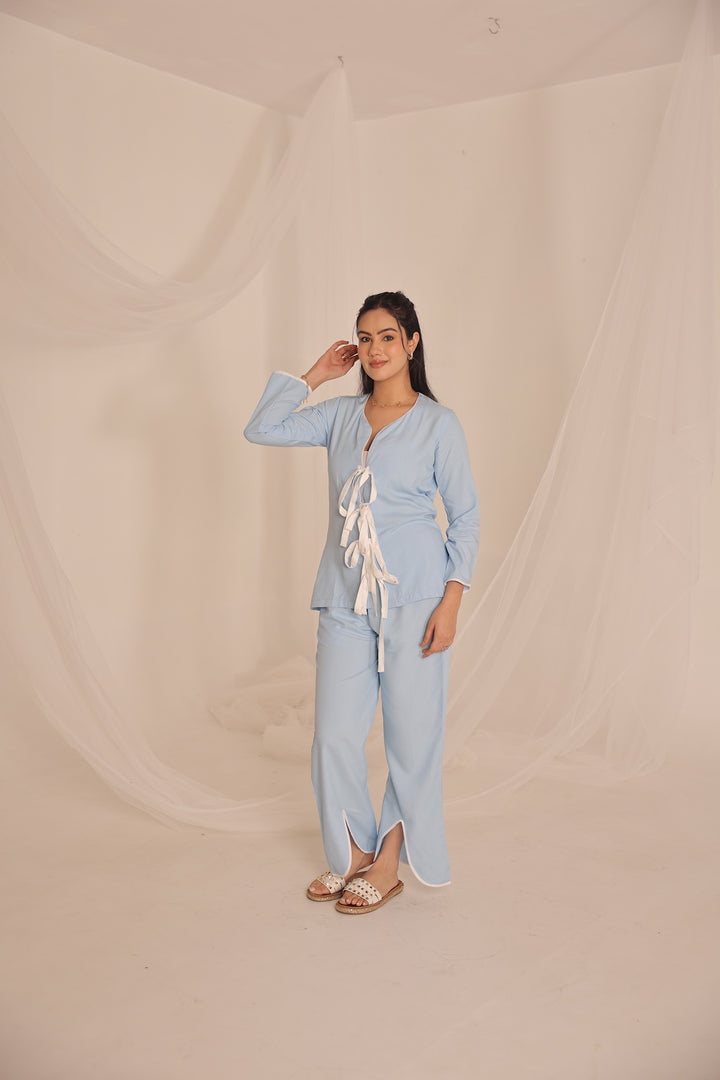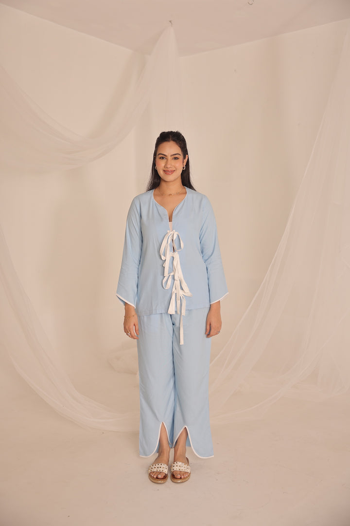 Description: This serene sky-blue co-ord features a playful tie-up top and delicate cut detailing at the pant hems, making it both cozy this set is your go-to for lounging in style or stepping out with relaxed confidence. Designed for all-day wear, it combines a flattering silhouette with thoughtful design details that strike the perfect balance between elegant, soft, and cozy.