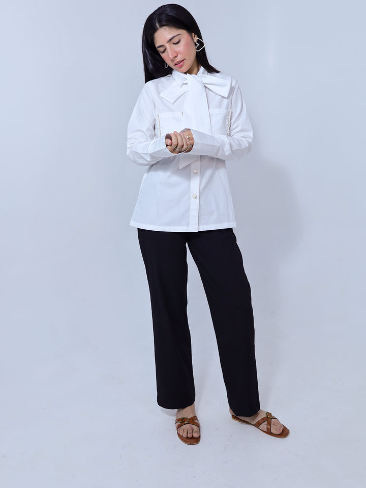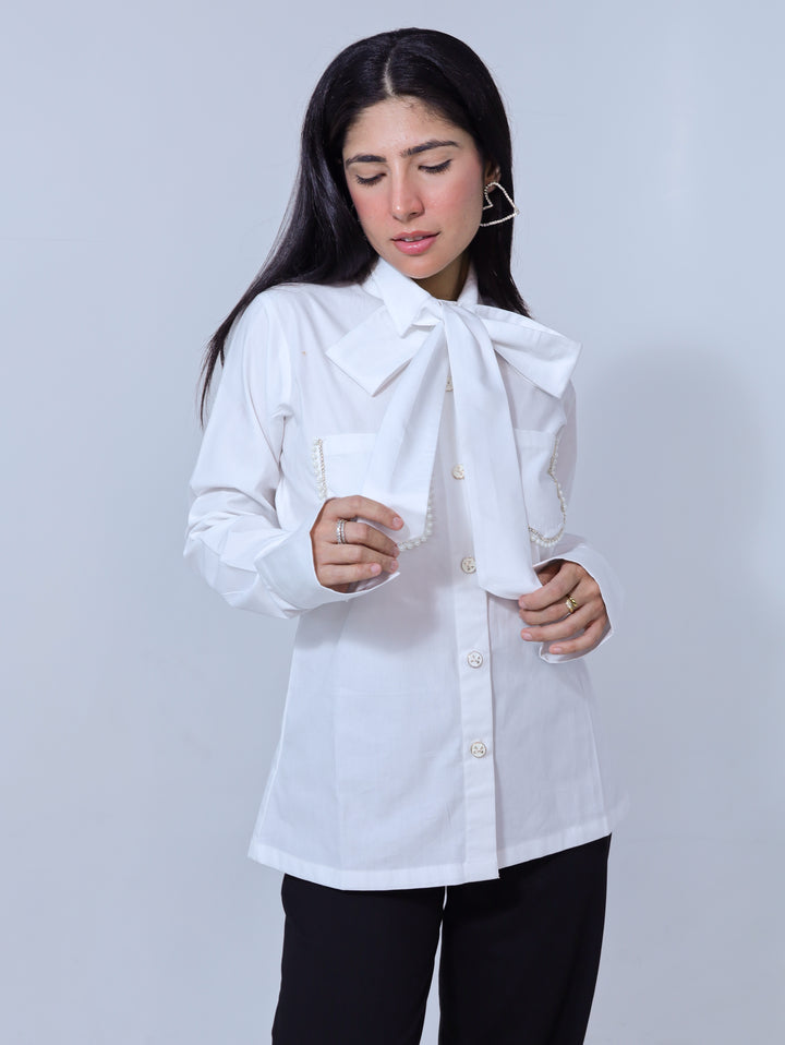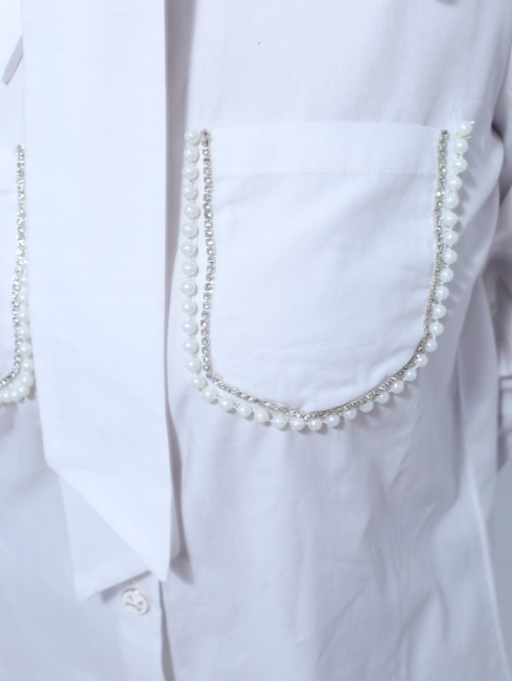 Description: Crafted from premium white cotton, this shirt features a bold oversized bow tie at the collar that adds a sophisticated touch. The standout detail—delicate pearl and crystal embellishments lining the front pockets—brings a refined charm that makes this piece effortlessly chic.